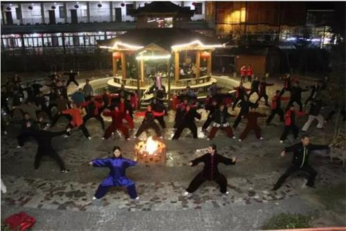 (三)讲方法——寓教于乐 孔雀开屏舞蹁跹 演绎神韵十三拳 夜晚篝火映红灯 金狮抖毛惊青山 夜炼——为了活跃培训氛围,为了解除拳友们一路风尘奔波的疲劳,报到当天晚上19时30分,在蓝色孔雀生态园在该园的园形亭楼前方架起了一堆木柴点燃了熊熊的篝火,此时此刻,跳动的火焰与楼亭上高高挂起的大红灯笼相映成景,程保荣老师率先垂范在一曲“骏马奔驰向边疆”,带领全体拳友跳起了太极舞——拉开了太极热身的晚会序幕 ;此时此刻,作为同门的师弟的陈立伟,倾情力唱“一二三四歌”——祝福全体拳友一帆风顺、二龙戏珠;三阳开泰、四季平安;你方唱罢我等场,此起彼伏亦歌亦舞,进入静养功的主题曲——采气功、缠丝功、站桩功、发力功,——一个一个细细领练,一边一边教人不倦,一左一右当头炮,百名拳友金狮抖毛,吼声如雷震惊青山!